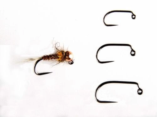 The TMC 403 BLJ features a 60 degree bend at the eye and will accommodate a slotted or slotted faceted tungsten bead nicely. The hooks feature needle sharp barbless points and they have incredible fish holding properties.